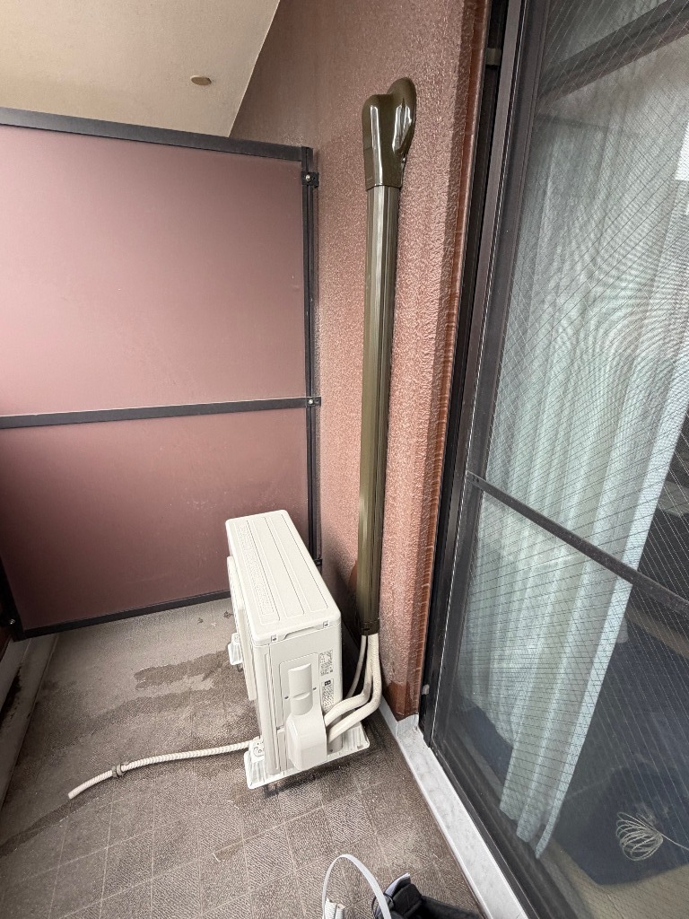 先日のエアコン取り付け工事は、マンションの室外機スペースが非常に狭いお宅でした。